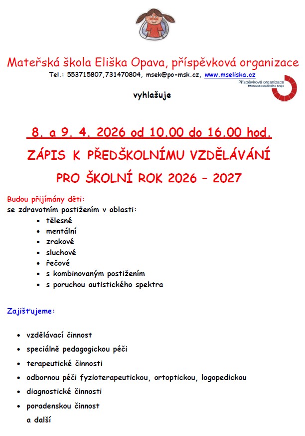 ZÁPIS K PŘEDŠKOLNÍMU VZDĚLÁVÁNÍ PRO ŠK. ROK 2026-2027